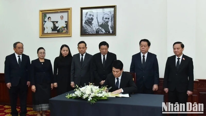 Sáng 4/4, Đoàn đại biểu cấp cao Đảng, Nhà nước Việt Nam do Chủ tịch nước Lương Cường dẫn đầu, Đoàn đại biểu cấp cao Chính phủ Việt Nam do Thủ tướng Chính phủ Phạm Minh Chính dẫn đầu và Đoàn đại biểu cấp cao Quốc hội Việt Nam do Phó Chủ tịch Quốc hội Nguyễn Khắc Định dẫn đầu đã viếng và ghi sổ tang tưởng niệm đồng chí Khamtay Siphandone, nguyên Chủ tịch Đảng Nhân dân Cách mạng Lào, nguyên Chủ tịch nước Lào.