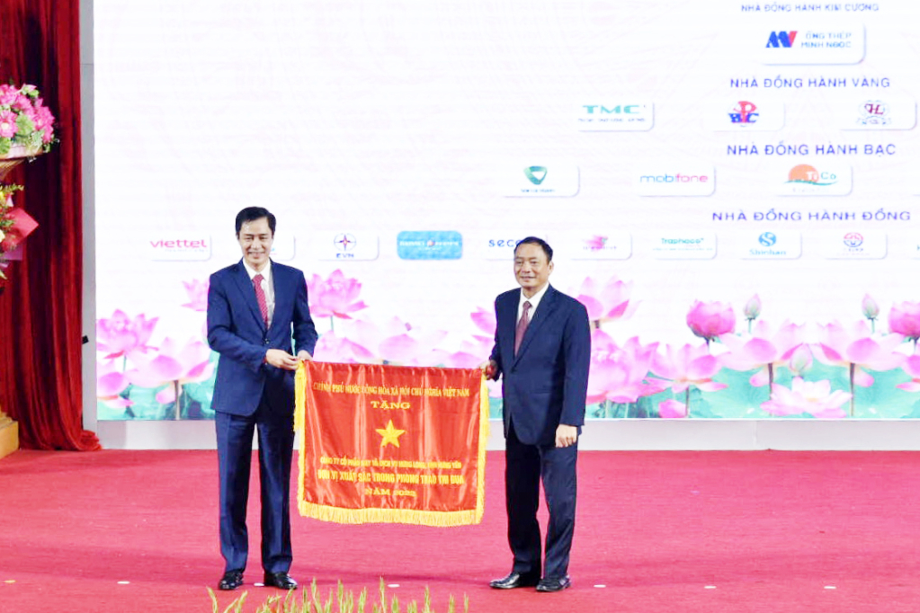 Đồng chí Trần Quốc Văn, Phó Bí thư Tỉnh ủy, Chủ tịch UBND tỉnh trao Cờ thi đua của Thủ tướng Chính phủ tặng Công ty cổ phần May và dịch vụ Hưng Long