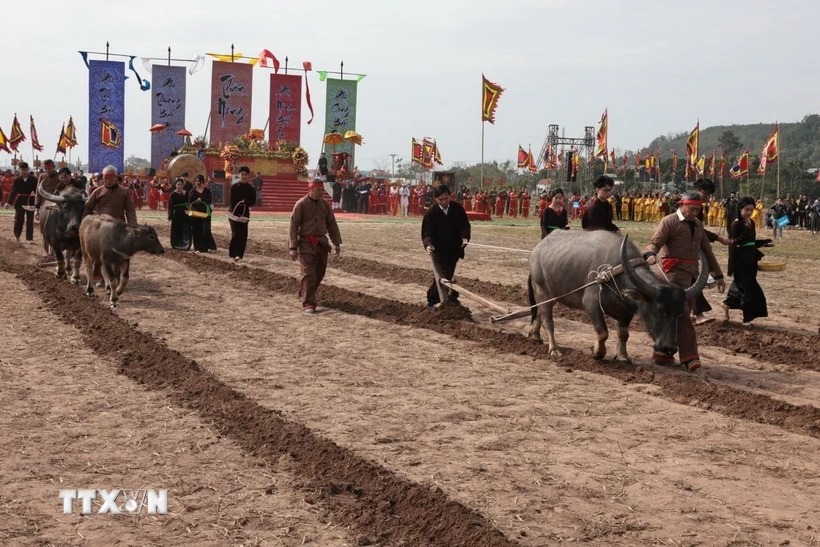 Nông dân thực hiện nghi thức cày ruộng đầu năm. (Ảnh: Trần Việt/TTXVN)