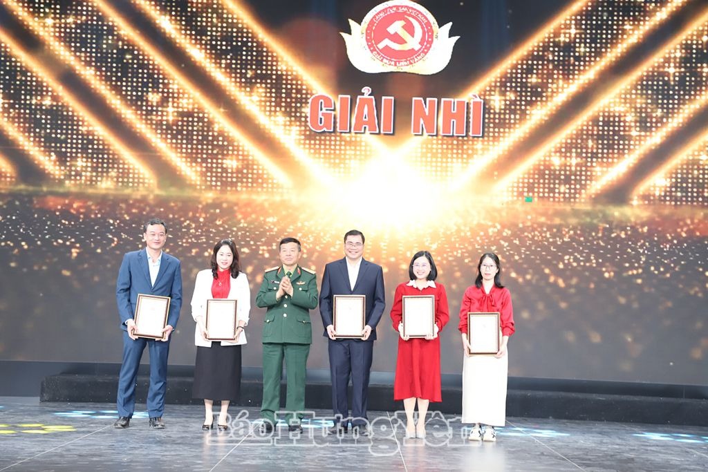 Thiếu tướng Phạm Văn Huấn, nguyên Tổng Biên tập Báo Quân đội nhân dân trao giải Nhì cho các tác giả, nhóm tác giả đoạt giải Đồng chí Trưởng ban Nội chính Tỉnh ủy Nguyễn Văn Chiến trao giải Ba cho các tác giả, nhóm tác giả đoạt giải