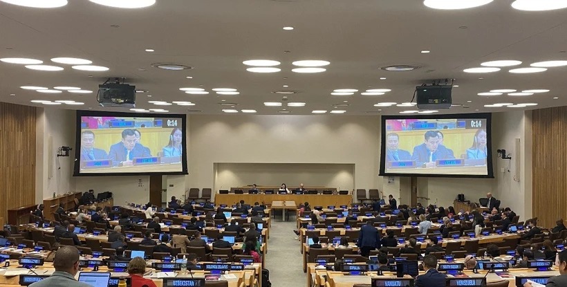 Đại sứ Đặng Hoàng Giang, Trưởng phái đoàn Đại diện thường trực Việt Nam tại Liên hợp quốc, phát biểu tại một hội nghị của Liên hợp quốc về chống buôn bán bất hợp pháp vũ khí. (Ảnh: TTXVN phát)