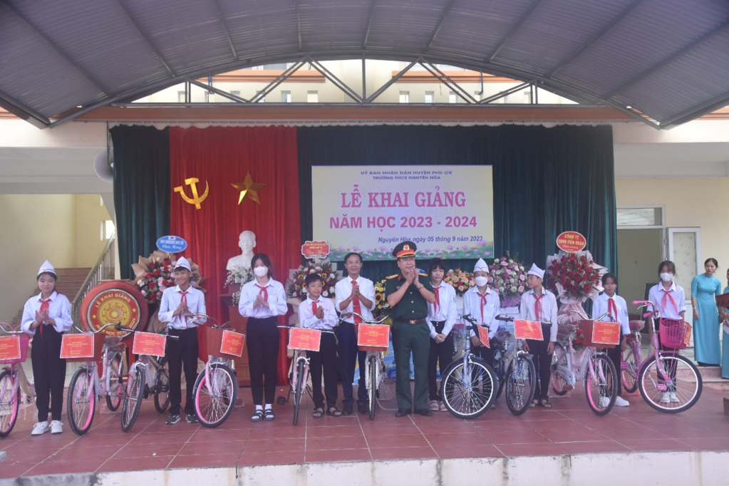 Lãnh đạo Ban CHQS huyện Phù Cừ trao xe đạp tặng học sinh Trường THCS Nguyên Hoà vượt khó, đạt thành tích cao trong học tập