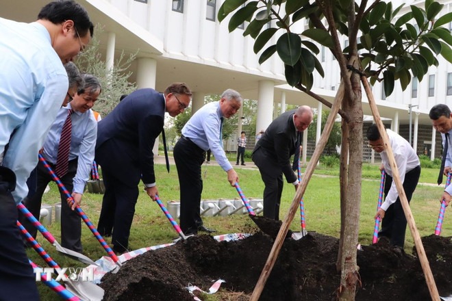 Phó Thủ tướng thường trực Nguyễn Hòa Bình trồng cây lưu niệm tại khuôn viên Trường Đại học Việt Đức. (Ảnh: Văn HướngTTXVN)