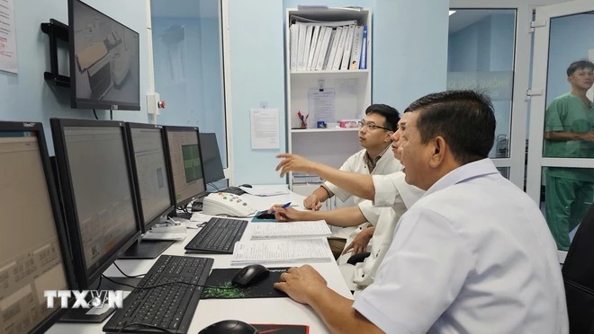 Bác sĩ, kỹ thuật viên khoa Xạ 2, Trung tâm Ung bướu, Bệnh viện Trung ương Huế thực hiện xạ trị cho bệnh nhi. (Ảnh: Mai Trang/TTXVN)