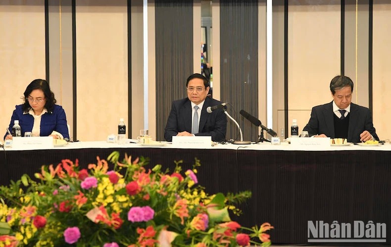 Thủ tướng Phạm Minh Chính phát biểu ý kiến tại cuộc làm việc với các tập đoàn hàng đầu của Nhật Bản về vi mạch bán dẫn. (Ảnh: THANH GIANG)