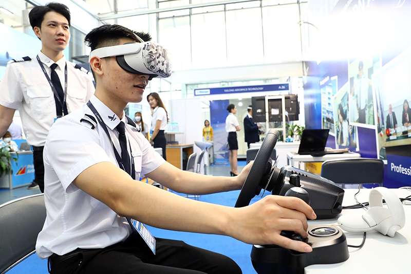 Thử nghiệm mô hình đào tạo lái xe trong sân bay sử dụng thực tế ảo tại Triển lãm quốc tế hàng không Việt Nam 2022 _Ảnh: TTXVN