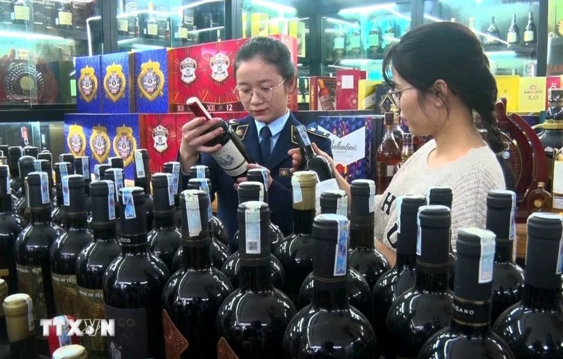 Cán bộ Cục Quản lý thị trường tỉnh Ninh Bình kiểm tra nguồn gốc xuất xứ của hàng hóa. (Ảnh: Thùy Dung/TTXVN)