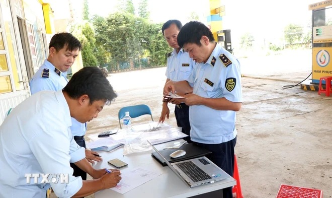 Đội Quản lý thị trường số 2 kiểm tra cây xăng ở huyện Đăk Tô (Kon Tum). (Ảnh: Cao Nguyên/TTXVN)