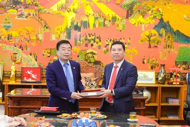 Chủ tịch Hội đồng Quản trị Vinatex Lê Tiến Trường tặng quà biểu trưng năm Giáp Thìn 2024 cho lãnh đạo Tổng Công ty May 10. (Ảnh: PV/Vietnam+)