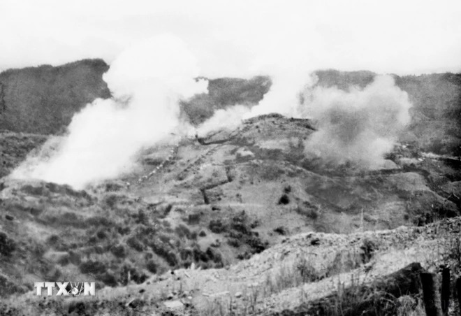 Các đơn vị xung kích của ta dưới sự yểm trợ của pháo binh tấn công sân bay Mường Thanh. (Ảnh: Tư liệu TTXVN)