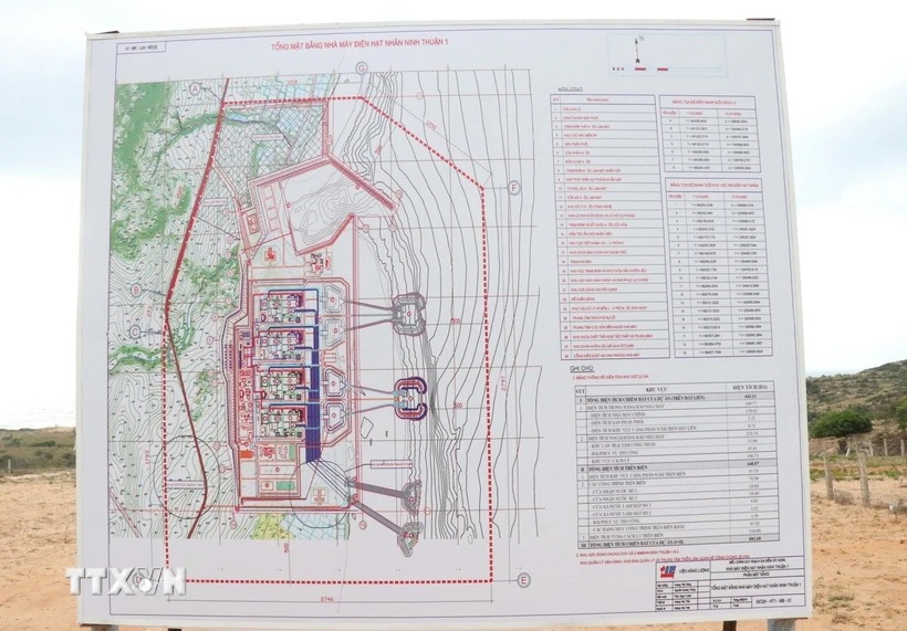 Sơ đồ tổng mặt bằng nhà máy điện hạt nhân Ninh Thuận 1 được cắm ngay tại vùng dự án (xã Phước Dinh, huyện Thuận Nam) để người dân nắm thông tin. (Ảnh: Công Thử/TTXVN)