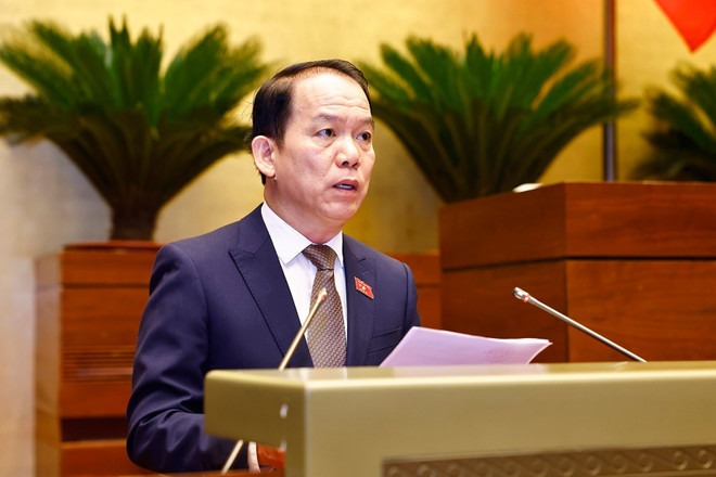 Chủ nhiệm Ủy ban Pháp luật và Tư pháp Hoàng Thanh Tùng đã trình bày Báo cáo thẩm tra dự thảo Nghị quyết. (Ảnh: TTXVN)