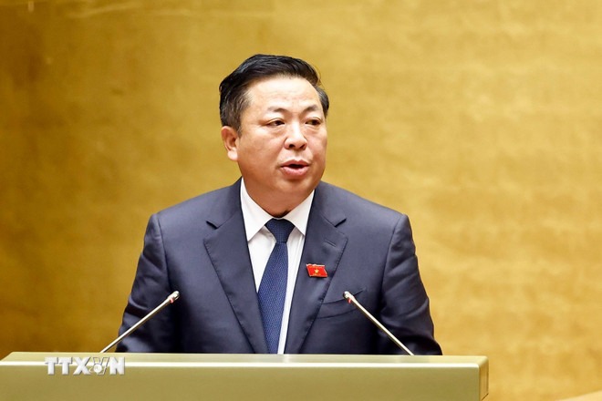Bộ trưởng Bộ Xây dựng Trần Hồng Minh thừa ủy quyền của Thủ tướng Chính phủ đã trình bày Tờ trình dự thảo Nghị quyết của Quốc hội về thí điểm một số cơ chế, chính sách đặc thù phát triển nhà ở xã hội. (Ảnh: TTXVN)