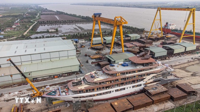 Nhà máy đóng tàu Khiên Hà (Hải Phòng) đang gấp rút hoàn thiện các đơn đặt hàng đóng mới tàu đúng tiến độ, đảm bảo an toàn, chất lượng cho khách hàng. (Ảnh: Hoàng Hiếu/TTXVN)