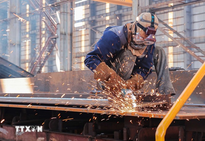Hoàn thiện bề mặt khi đóng mới tàu biển tại Nhà máy đóng tàu Nam Triệu (Hải Phòng). (Ảnh: Hoàng Hiếu/TTXVN)