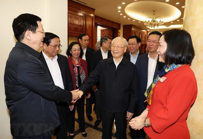 Tổng Bí thư Nguyễn Phú Trọng với các đồng chí lãnh đạo Đảng, Nhà nước tham dự phiên họp. (Ảnh : Trí Dũng/TTXVN)