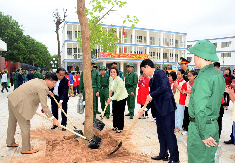 Các đại biểu trồng cây xanh trong khuôn viên Trường Tiểu học và THCS Bần Yên Nhân