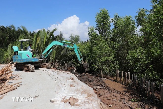 Gia cố tuyến đường Miễu Bà (xã Phú Tân, huyện Tân Phú Đông, Tiền Giang), phòng, chống triều cường. (Ảnh: Minh Trí/TTXVN)