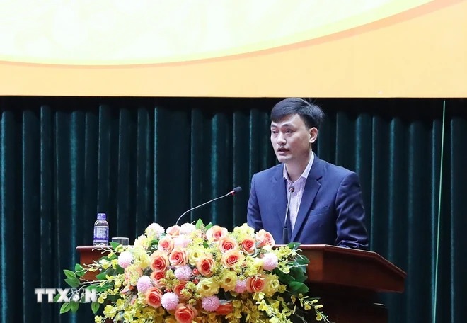 Đại diện cử tri xã Sơn Hà, huyện Nho Quan phát biểu tại buổi tiếp xúc cử tri. (Ảnh: Đức Phương/TTXVN)