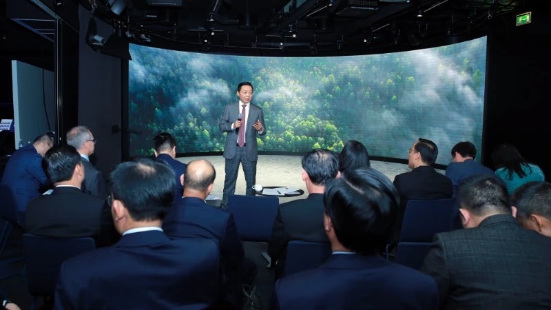 Phó Thủ tướng Trần Hồng Hà phát biểu tại cuộc làm việc với một số doanh nghiệp hàng đầu của Phần Lan về điện, năng lượng tái tạo, môi trường, chiều 27/11 (giờ địa phương), tại thủ đô Helsinki. (Ảnh: VGP)