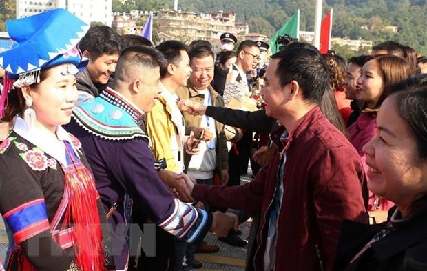 Gặp mặt giao lưu giữa cư dân biên giới trên cầu Hồ Kiều II sau gần 3 năm đóng cửa biên giới chống dịch COVID-19. (Ảnh: Quốc Khánh/TTXVN)