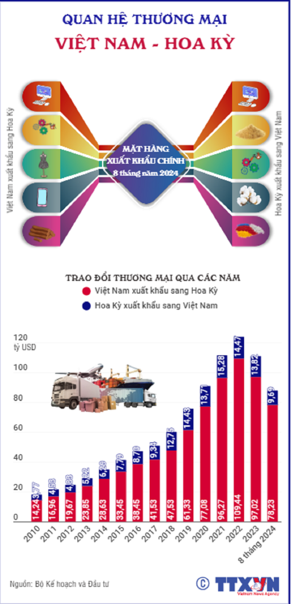 Trong 8 tháng của năm nay kim ngạch thương mại song phương đạt gần 88 tỷ USD, trong đó Việt Nam xuất sang Hoa Kỳ trên 78 tỷ USD./.