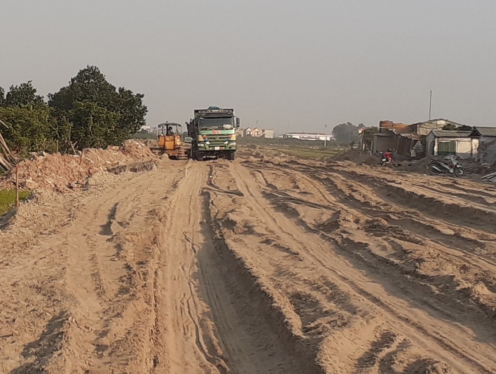 Cát sông đang rất cần thiết để phục vụ xây dựng các công trình, dự án trong tỉnh (Sử dụng cát sông để san lấp xây dựng đường giao thông tại thành phố Hưng Yên)