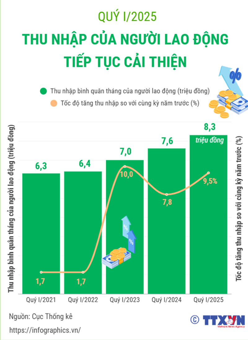 Quý 1 năm 2025, thu nhập bình quân tháng của người lao động tiếp tục được cải thiện, đạt 8,31 triệu đồng, tăng 131 nghìn đồng so với quý trước (8,18) và tăng 720 nghìn đồng so với cùng kỳ năm trước (7,59) tương đương với tăng 1,6% và tăng 9,5%./.