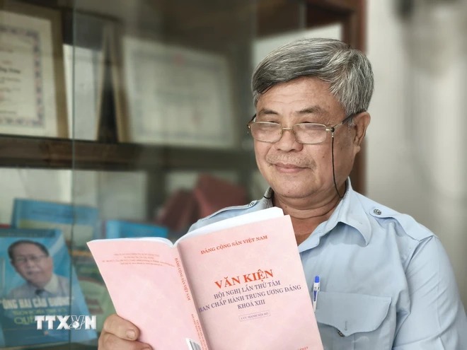 Ông Trần Văn Nguyện, Bí thư, Trưởng khu phố 3, thị Trấn Giồng Trôm (Giồng Trôm, Bến Tre) nghiên cứu Văn kiện Hội nghị lần thứ tám, Ban Chấp hành trung ương Đảng khóa 13. (Ảnh: Huỳnh Phúc Hậu/ TTXVN)