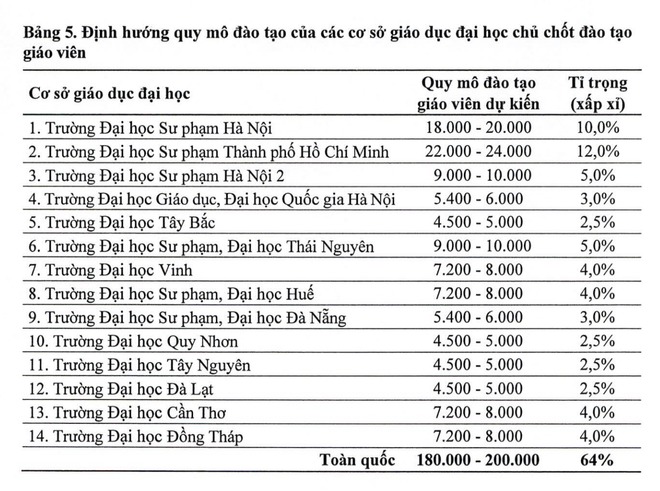 Theo đó, đến năm 2030, mạng lưới đại học đào tạo giáo viên dự kiến có từ 48 đến 50 cơ sở, giảm mạnh so với hiện nay. Hiện cả nước có 103 cơ sở đào tạo giáo viên, gồm 15 trường đại học sư phạm (6 trường đại học sư phạm, 6 trường đại học sư phạm kỹ thuật, 2 trường sư phạm thể dục thể thao, 1 trường sư phạm nghệ thuật), 50 trường đại học đa ngành và trường đại học đặc thù có đào tạo giáo viên, 20 trường cao đẳng sư phạm và 18 trường cao đẳng đa ngành có đào tạo giáo viên.
