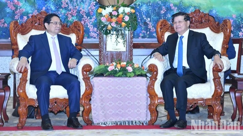 Trong khuôn khổ chuyến thăm Lào và đồng chủ trì Kỳ họp lần thứ 47 Ủy ban liên Chính phủ Việt Nam-Lào, sáng 10/1, tại Viêng Chăn, Thủ tướng Chính phủ Phạm Minh Chính hội kiến Tổng Bí thư, Chủ tịch nước Lào Thongloun Sisoulith.