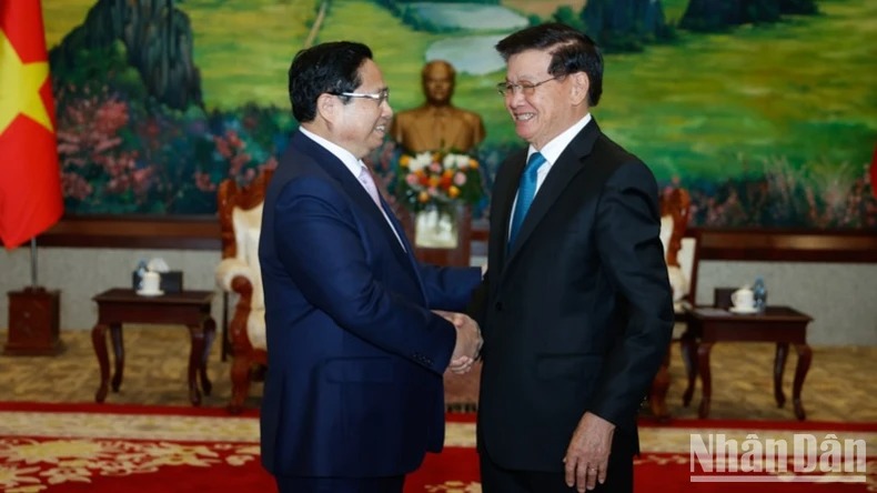 Thủ tướng Phạm Minh Chính hội kiến Tổng Bí thư, Chủ tịch nước Lào Thongloun Sisoulith. (Ảnh: THANH GIANG)