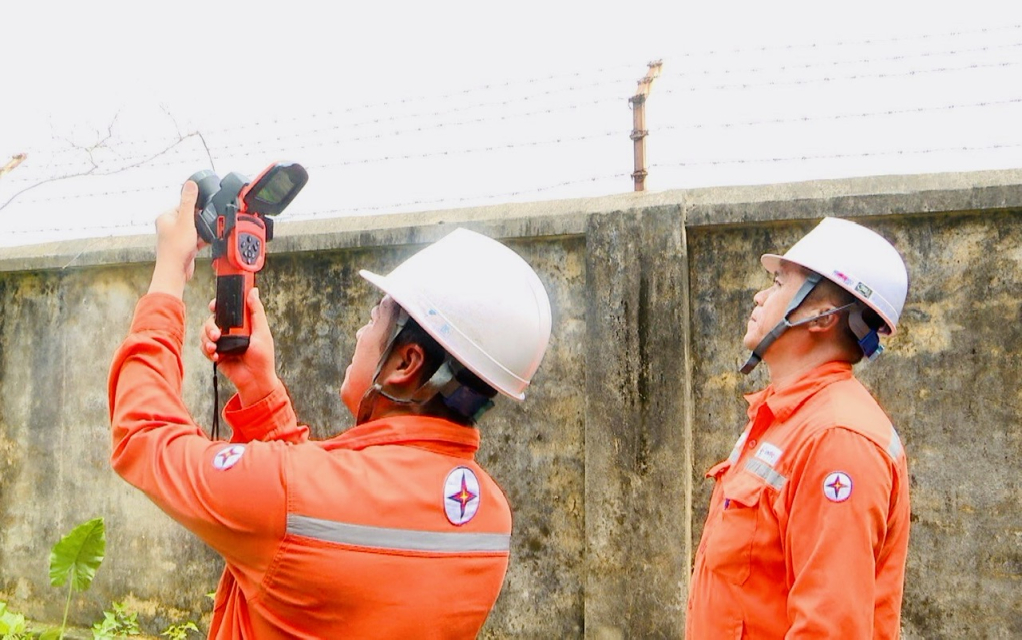 Nhân viên điện lực kiểm tra hệ thống lưới điện tại Trường THPT Minh Châu (Yên Mỹ)