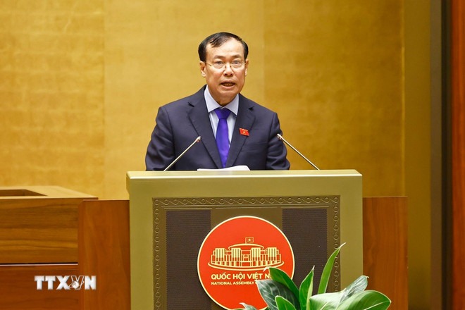 Chủ nhiệm Ủy ban Quốc phòng, An ninh và Đối ngoại của Quốc hội Lê Tấn Tới trình bày Báo cáo thẩm tra các dự án luật liên quan đến quốc phòng-an ninh. (Ảnh: Doãn Tấn/TTXVN)