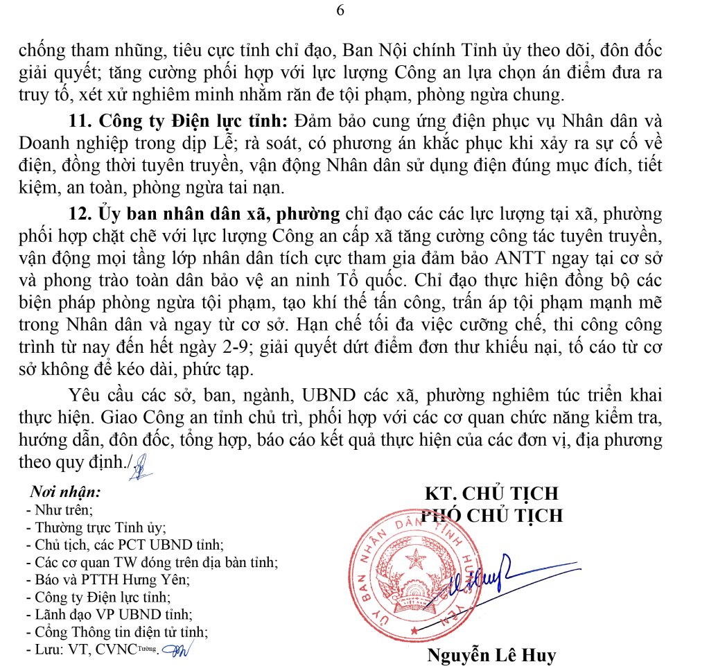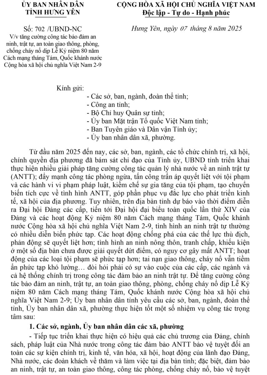 Công văn số 702/UBND-NC ngày 7/8/2025 của Ủy ban nhân dân tỉnh Hưng Yên về việc tăng cường công tác bảo đảm an ninh, trật tự, an toàn giao thông, phòng, chống cháy nổ dịp Lễ Kỷ niệm 80 năm Cách mạng tháng Tám, Quốc khánh nước Cộng hòa xã hội chủ nghĩa Việt Nam 2/9.