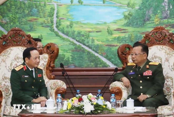 Đại tướng Chansamone Chanyalath, Ủy viên Bộ Chính trị, Phó Thủ tướng Chính phủ, Bộ trưởng Bộ Quốc phòng Lào tiếp Thượng tướng Trịnh Văn Quyết. (Ảnh: Xuân Tú/TTXVN)