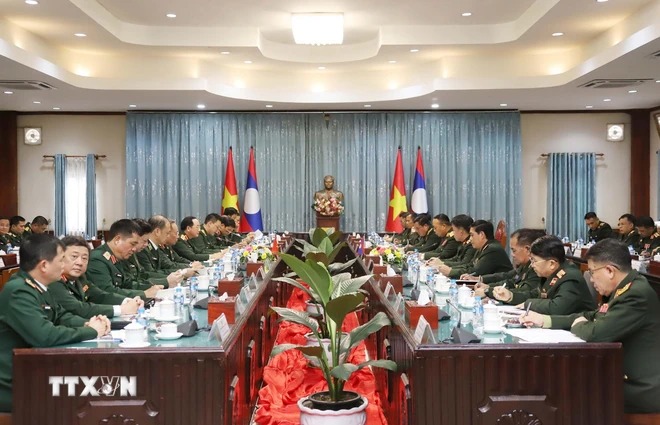 Đoàn Tổng cục Chính trị Quân đội Nhân dân Việt Nam hội đàm với đoàn Tổng cục Chính trị Quân đội Nhân dân Lào. (Ảnh: Xuân Tú/TTXVN)