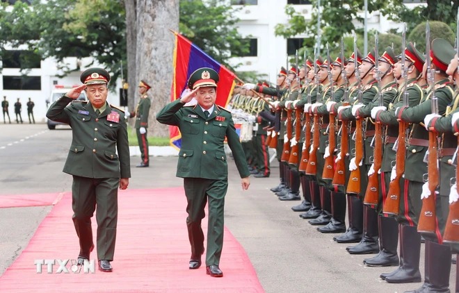 Thượng tướng Thongloi Silivong (trái), Ủy viên Trung ương Đảng, Thứ trưởng Bộ Quốc phòng, Chủ nhiệm Tổng cục Chính trị Quân đội Nhân dân Lào và Thượng tướng Trịnh Văn Quyết (phải), Bí thư Trung ương Đảng, Ủy viên Thường vụ Quân ủy Trung ương, Chủ nhiệm Tổng cục Chính trị Quân đội Nhân dân Việt Nam duyệt đội danh dự. (Ảnh: Xuân Tú/TTXVN)