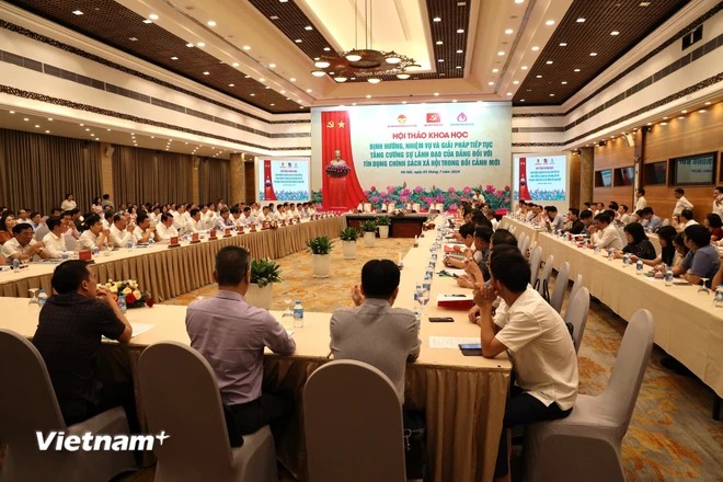 Hội thảo khoa học “Định hướng, nhiệm vụ và giải pháp tiếp tục tăng cường sự lãnh đạo của Đảng đối với tín dụng chính sách xã hội trong bối cảnh mới mới,” ngày 2/7. (Ảnh: Vietnam+)