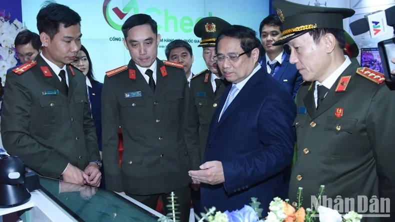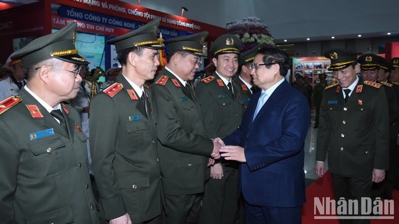 Thủ tướng Phạm Minh Chính tham quan gian trưng bày sản phẩm công nghệ cao của ngành Công an. (Ảnh: TRẦN HẢI)