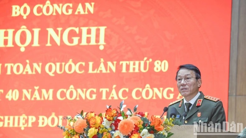 Phát biểu ý kiến khai mạc Hội nghị, Bộ trưởng Công an Lương Tam Quang nêu rõ: Hội nghị Công an toàn quốc lần thứ 80 được tổ chức để tổng kết đánh giá tình hình, kết quả các mặt công tác công an năm 2024, tổng kết 40 năm công tác công an phục vụ sự nghiệp đổi mới đất nước, nhìn lại 2 năm thực hiện Nghị quyết số 12-NQ/TW của Bộ Chính trị về đẩy mạnh xây dựng lực lượng Công an nhân dân thật sự trong sạch, vững mạnh, chính quy, tinh nhuệ, hiện đại, đáp ứng yêu cầu, nhiệm vụ trong tình hình mới và tổng kết phong trào thi đua “Vì an ninh Tổ quốc” năm 2024, phát động phong trào thi đua “Vì an ninh Tổ quốc" năm 2025 trong lực lượng Công an nhân dân.