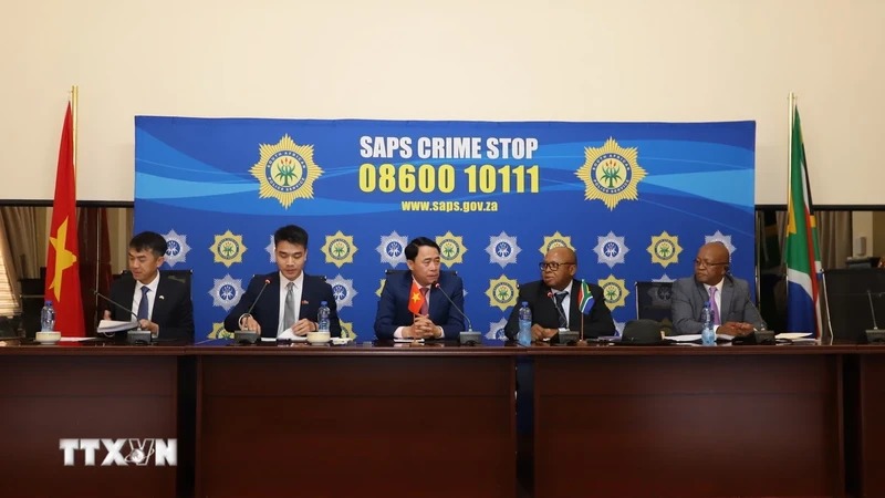 Đoàn đại biểu cấp cao Bộ Công an do đồng chí Trung tướng Lê Quốc Hùng - Ủy viên Trung ương Đảng, Thứ trưởng Bộ Công an làm việc với Bộ Cảnh sát Nam Phi. (Ảnh: Hoàng Minh/TTXVN)