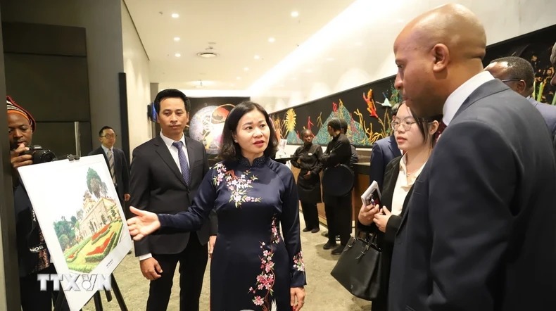 Bà Nguyễn Thị Tuyến, Ủy viên Trung ương Đảng, Phó Bí thư Thường trực Thành ủy Hà Nội giới thiệu hình ảnh Hà Nội với khách mời Nam Phi. (Ảnh: Hồng Minh/TTXVN)