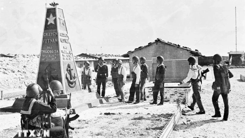Lực lượng Đặc công hải quân Đoàn 126 tuần tra lại khu vực cột mốc chủ quyền trên đảo Trường Sa được giải phóng, ngày 29/4/1975. (Ảnh: TTXVN)
