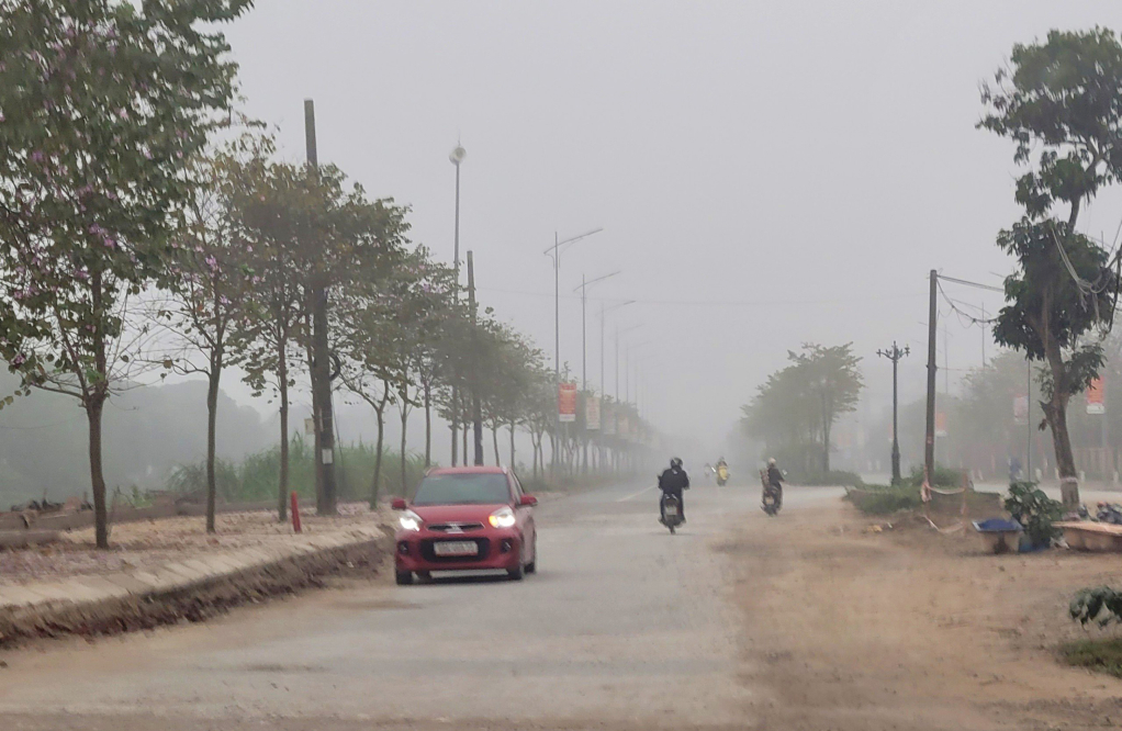 Dù hơn 8 giờ sáng, nhiều tuyến đường ở thành phố Hưng Yên vẫn dày đặc sương mù,
