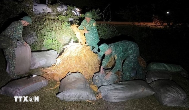 Lực lượng Biên phòng thu giữ lô hàng thuốc lá lậu do các đối tượng buôn lậu vứt bỏ lại khi bị truy đuổi. (Ảnh: TTXVN phát)