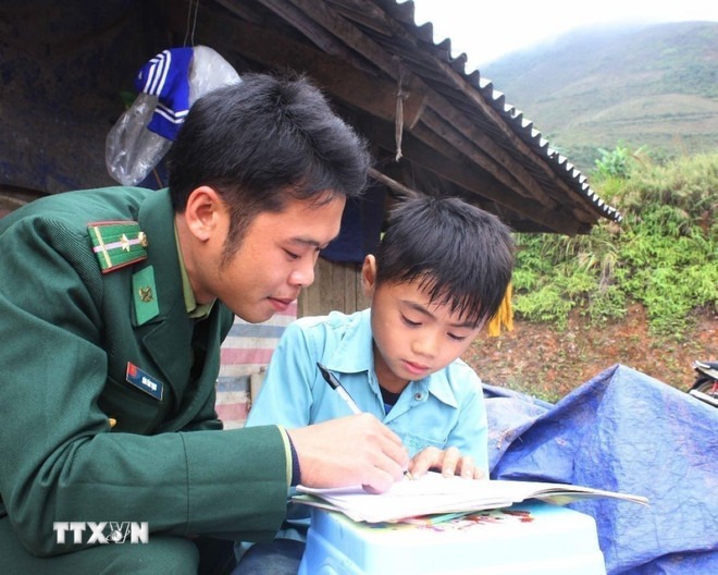 Ngoài việc giúp dân xây dựng nông thôn mới, Bộ đội Biên phòng tỉnh Cao Bằng còn giúp nhiều em nhỏ nghèo theo chương trình “Nâng bước em đến trường.” (Ảnh: Quốc Đạt - TTXVN)