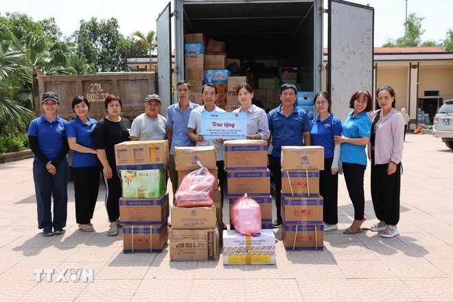 Đoàn thanh niên Thông tấn xã Việt Nam hỗ trợ người dân vùng bị ngập lụt tại Phú Thọ. (Ảnh: Tạ Toàn/TTXVN