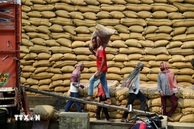 Công nhân vận chuyển gạo tại nhà kho ở Jalandhar, Ấn Độ. (Ảnh: ANI/TTXVN)