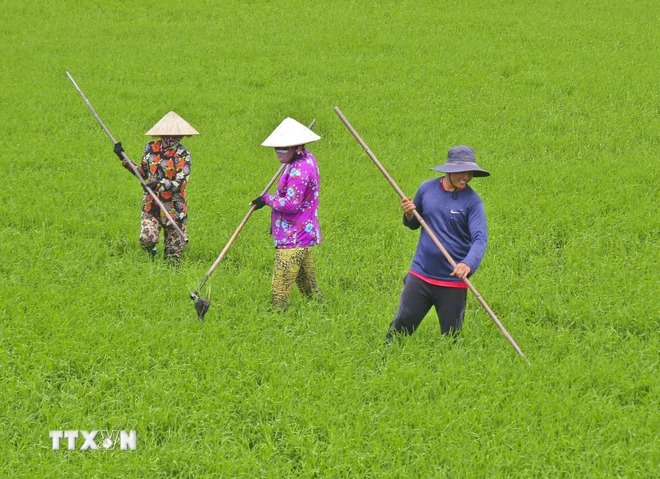 Nông dân huyện Vị Thủy, tỉnh Hậu Giang, chăm sóc lúa lúa Thu Đông 2024. (Ảnh: Duy Khương/TTXVN)